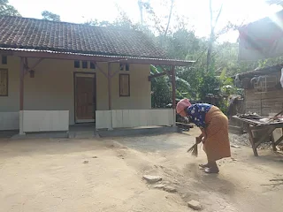 Salah satunya dengan menyapu halaman rumahnya bersama cucunya . Cucunya yang bernama Anto (29) itu sangat sibuk membantu neneknya Mbah  mainem membersihkan rumah barunya. Selain itu sisa dari pembangunan juga masih sedikit berserakan. Perku senfuhan tangan untuk dirapikan agar sedikit cantik.